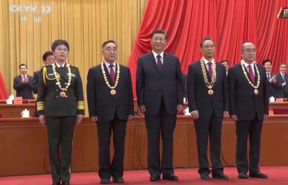 在全場(chǎng)熱烈的掌聲中,在人們崇敬的目光注視下,4位國(guó)家勛章和國(guó)家榮譽(yù)稱號(hào)獲得者受邀到主席臺(tái)就座。